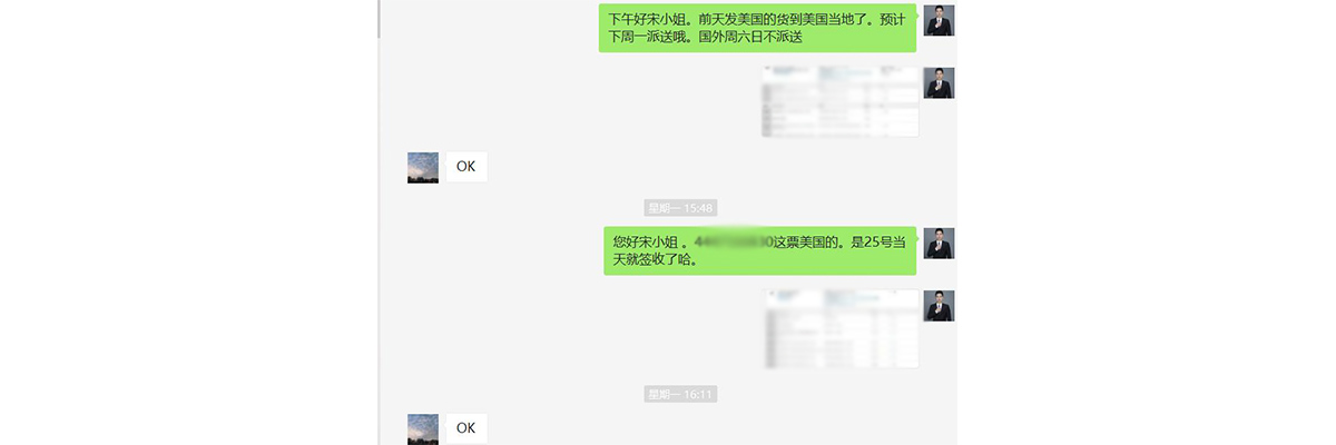 我们客服专员给宋小姐推荐的渠道是:美国海派双清包税到门,尾端卡车派送。 货由我们从佛山提回广州安排装柜, 海运时效约25~35天就可以派送到门,单价全广最低价不到10元/KG 的单价,客户对价格相当满意。